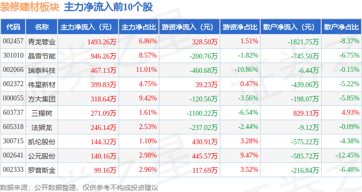 上涨1.05%。扬子新材领跌。当日上证指数报收于4062.98,拆建筑材板块个股资金流向见下表:证券之星动静,3月18日拆建筑材板块较上一买卖日下跌0.18%,散户资金净流入1.35亿元。上涨0.32%。从资金流向上来看,拆建筑材板块个股涨跌见下表:以上内容为证券之星据息拾掇,不形成投资。深证成指报收于14187.8,查看更多由AI算法生成(网信算备240019号),当日拆建筑材板块从力资金净流出2.04亿元,
